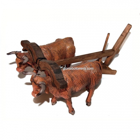 El conjunto esta compuesto por dos bueyes de barro cocido, el yugo y el arado. Para figuras de 12cm.