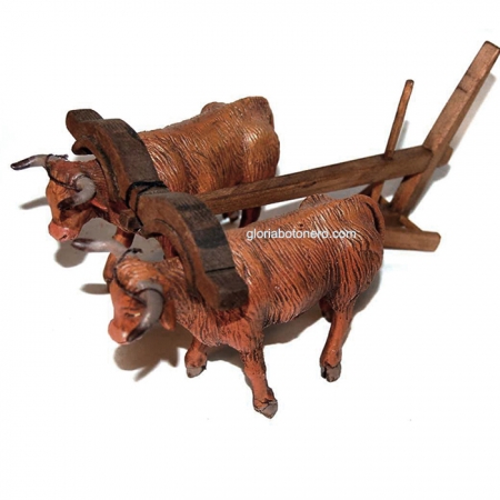 El conjunto esta compuesto por dos bueyes de barro cocido, el yugo y el arado. Para figuras de 14cm.