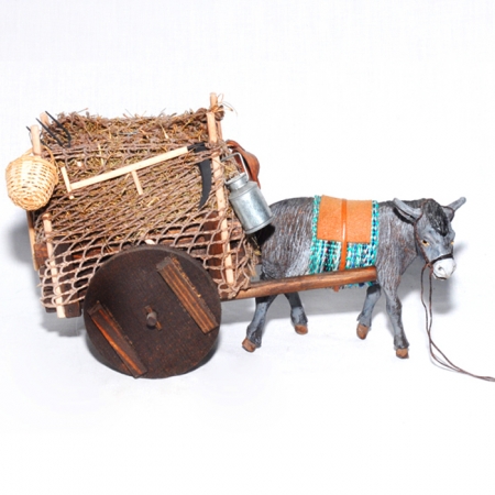 El burro es de barro cocido. El carro de madera esta cargado con paja y lleva diversos complementos colgados por ambos lados. Para figuras de 14 cm.