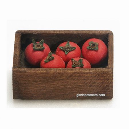 Caja de madera con tomates, modelados a mano con porcelana rusa. Dimensiones de la caja 4x 3 cm.