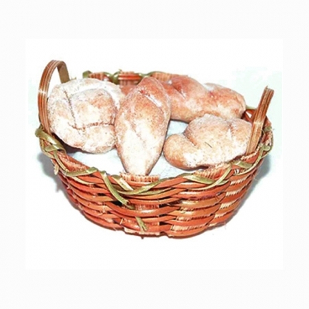 Cesta de mimbre con pan autentico. Medidas 6x4cm. y 3,3 de alto.