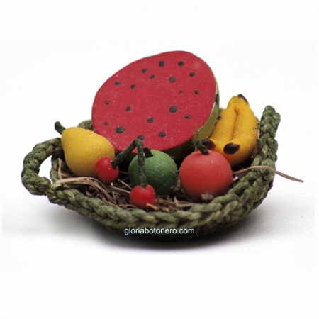 Cesta con frutas surtidas y melón modelados a mano con porcelana rusa. Diametro 4,5 cm.
