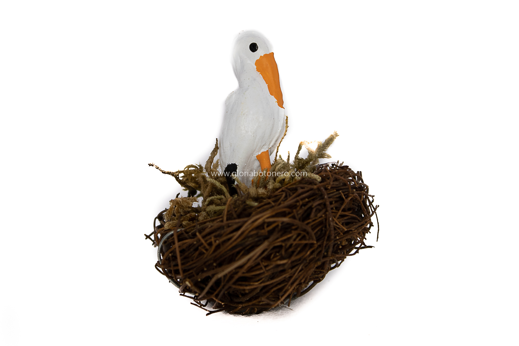 Cesto con cigueña de resina pequeña para complementos de belén y miniaturas. 4cms de alto y 3,5cms de diámetro.