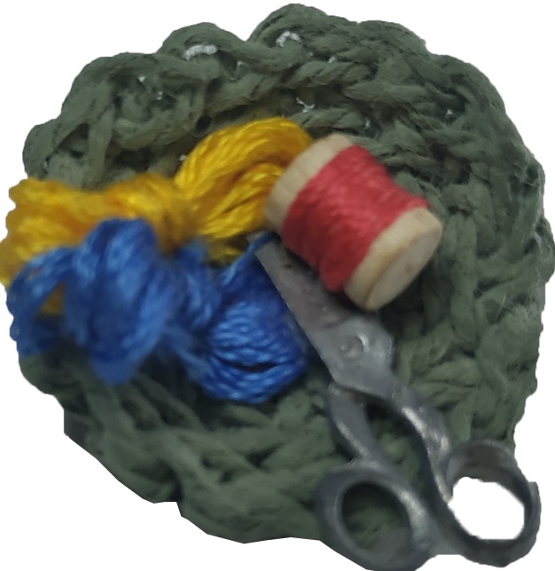 Cesto de lana pequeño en miniatura con tijera e hilos. 2,50cms de diámetro
