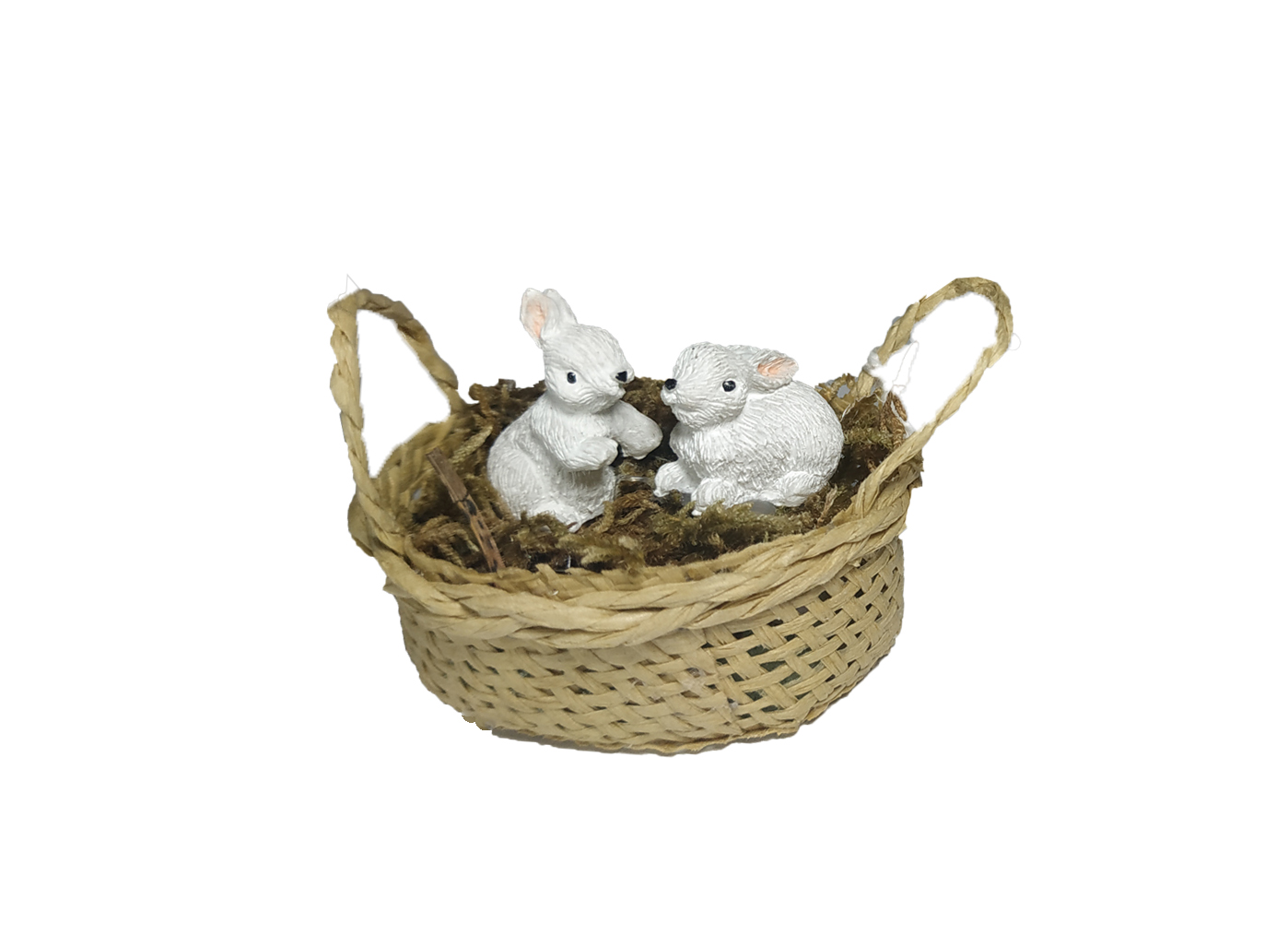 Conejos de resina en cesto ovalado para complementos de belén y miniatura. Tamaño: 4cms de alto y 5cms de diámetro. Precio por unidad-
