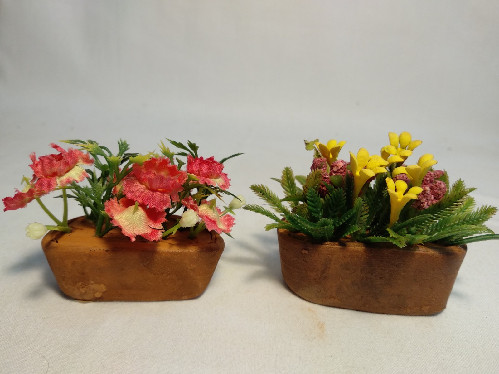 Jardinera de barro de 5 cm de largo. Altura total con las flores 5 cm.