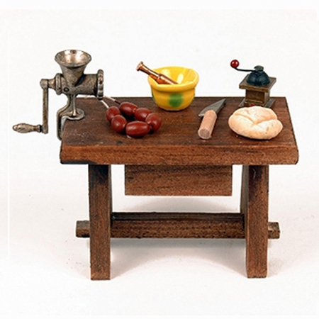 La mesa es de madera y las miniaturas de materiales diversos. Dimensiones 9,2×4,8 y 5,7cm. de alto