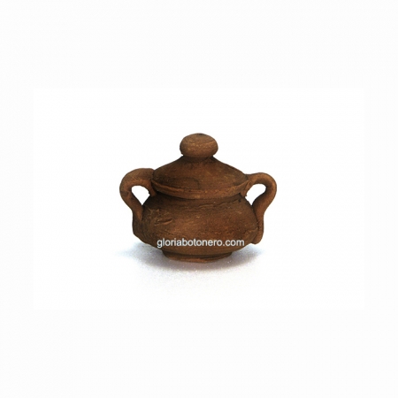 Elaborada con torno. Es de barro cocido y envejecido. Medidas de alto 1,8cm. Es una sola pieza.