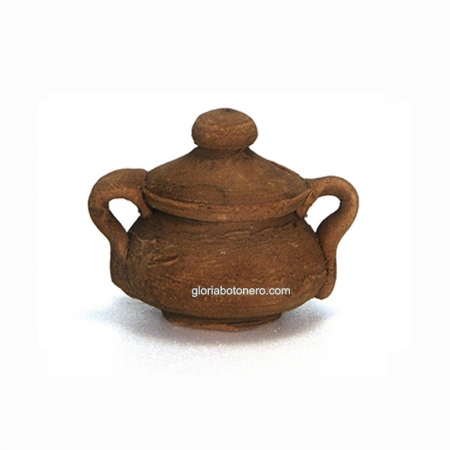 Elaborada con torno. Es de barro cocido y envejecido. Medidas de alto 2,3cm. Es una sola pieza.