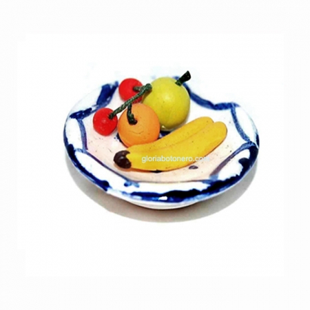 Plato de barro vidriado y fruta modelada con porcelana rusa. Diametro 3,4 cm.