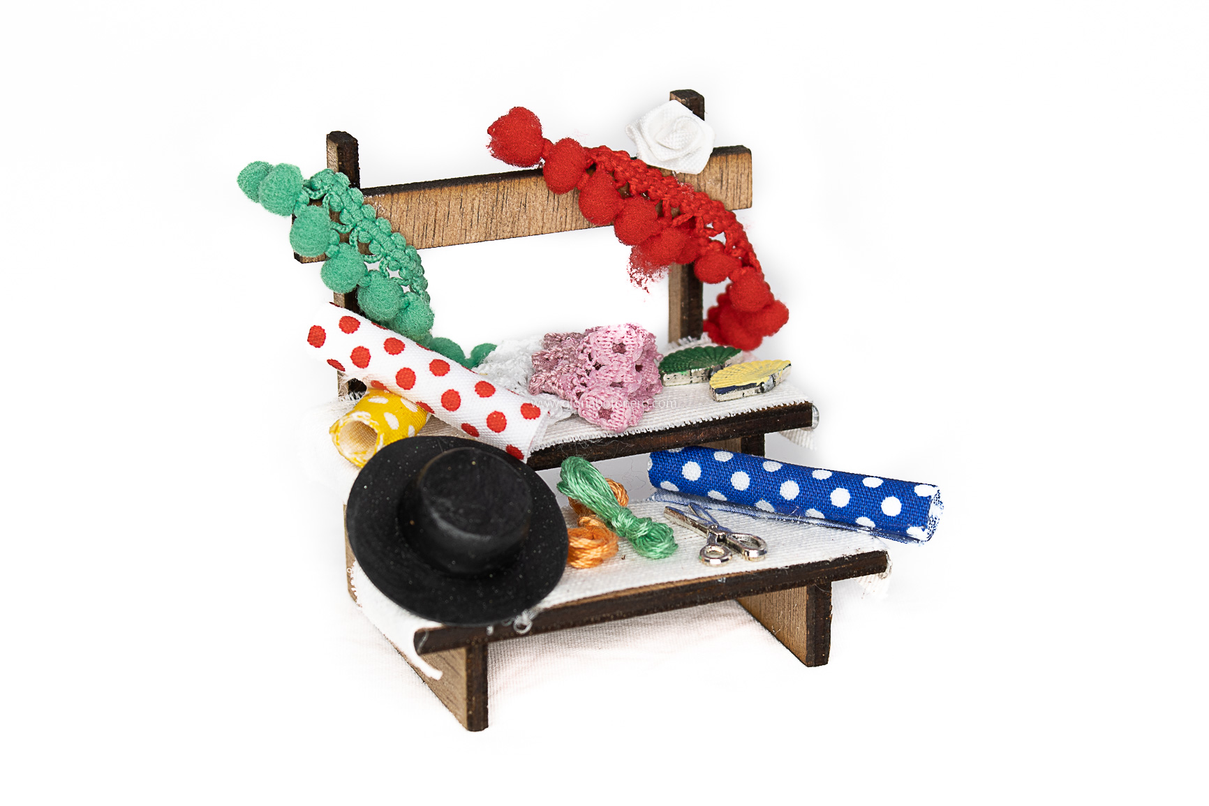 Material: Madera. Incluye artículos de tela y metal.
