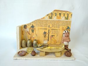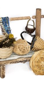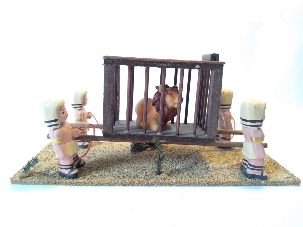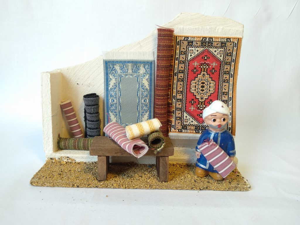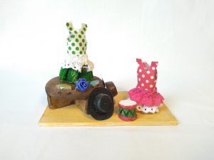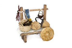 Medidas: Largo 6 cm x Ancho 2,7 cm x Alto 5,7 cm. Material: Madera. Incluye complementos en esparto. Idóneo para figuras de 5 cm como los cabezones de Alborox.
