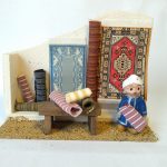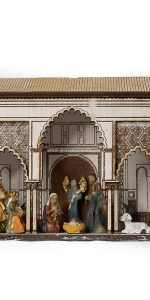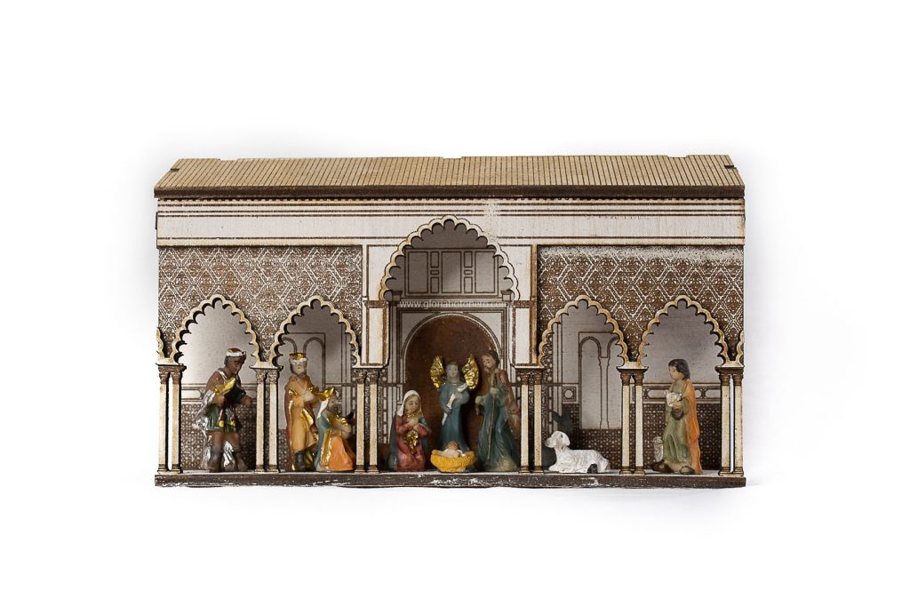 Reproducción del Patio de las Doncellas del Real Alcázar de Sevilla. Incluye misterio gitano de Alborox de 5 cm. Medidas: Largo 27,3 cm x Ancho 6,7 cm x Alto 16 cm. Material: Madera y figuras de barro cocido.
