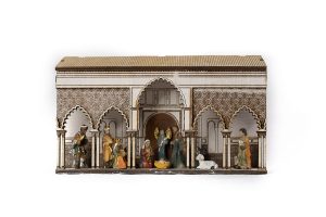 Portal con Misterios, Reyes y Pastor de Puig. Medidas: 15 x 14 x 9 cm aprox Incluye: Misterio, Ángel, Reyes Magos, Pastor y oveja Escala de las figuras: 4,5 cm Material : Portal de corcho, base de madera y figuras de resina.